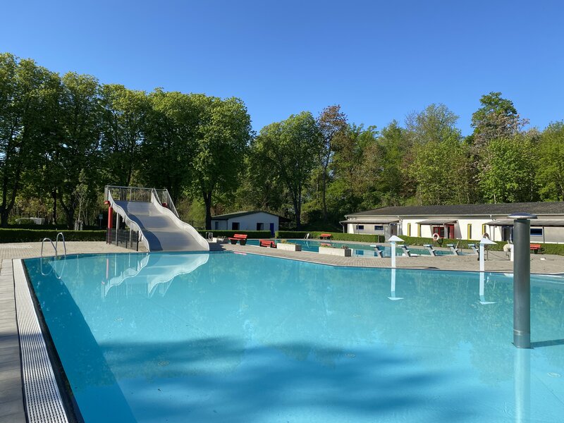 Im Nichtschwimmerbecken erwarten Sie Wassertiefen bis zu 1,35 Meter – ideal für Kinder, Jugendliche und alle, die entspannt planschen möchten. Highlight ist die große Rutsche, die für jede Menge Spaß und Action sorgt.